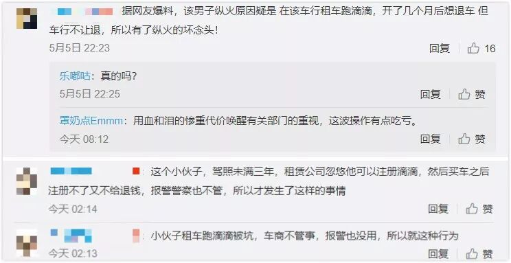 那么,这位刘姓男子为何会做出这样极端的行为呢?火灾发生后,多位网友对刘姓男子纵火的原因进行了分析。虽然大家的描述细节有出入,但是基本情况一致:这位男子买车跑滴滴,此后想退车、但是租赁公司不给退、因此纵火。