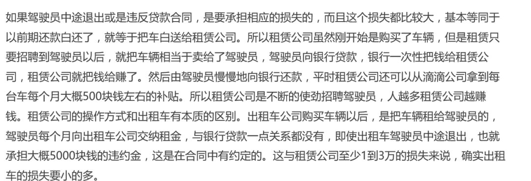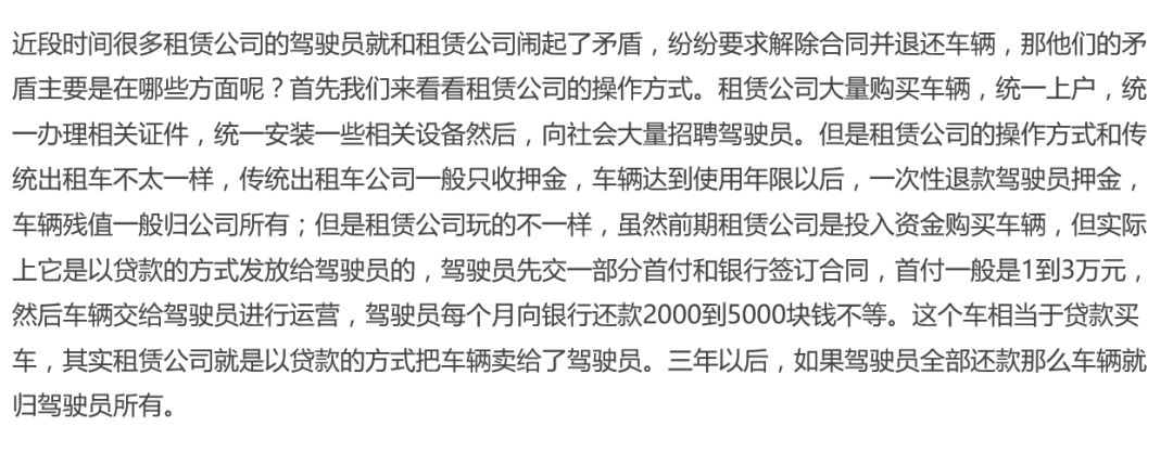 网上一篇名为《思考题:网约车司机以租代购开滴滴,是赚还是坑!》说的非常透彻:租赁公司的操作方式和传统出租车不太一样,传统出租车公司一般只收押金,车辆达到使用年限以后,一次性退款驾驶员押金,车辆残值一般归公司所有;但是租赁公司玩的不一样,虽然前期租赁公司是投入资金购买车辆,但实际上它是以贷款的方式发放给驾驶员的,驾驶员先交一部分首付和银行签订合同,首付一般是1到3万元,然后车辆交给驾驶员进行运营,驾驶员每个月向银行还款2000到5000块钱不等。这个车相当于贷款买车,其实租赁公司就是以贷款的方式把车辆卖给了驾驶员。三年以后,如果驾驶员全部还款那么车辆就归驾驶员所有。