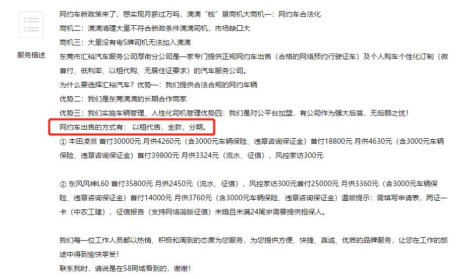 另外,有业内人士爆料,有些打着滴滴旗号招聘司机的汽车租赁公司,实际上与滴滴有合作关系。而这些汽车租赁公司会以高回报诱骗客户买车;表示跑滴滴的车辆要在滴滴合作的公司挂靠才能多接单,以此引诱车主加价几万买车,而司机买车后每月还要月供4-5千元,间接绑定滴滴司机来为该公司赚钱,司机实际赚不到多少。
