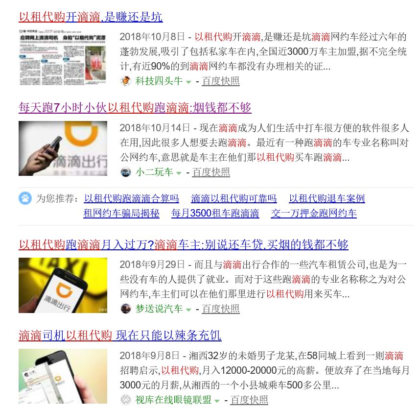 就目前来说,很多租赁公司都在推“以租代购开滴滴”模式,但是其中暴露出不少问题。在百度上可以看出,很多滴滴司机因此被租赁公司绑架了,生活变得窘迫。